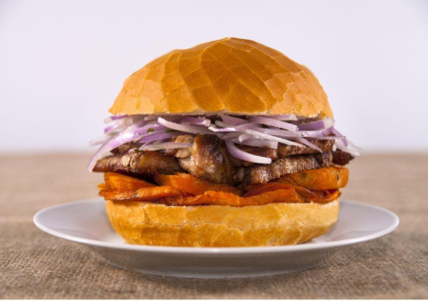 Crunchy bread filled with juicy pork chicharrón, fried sweet potatoes, and fresh criolla salsa. The perfect way to start your day with energy!